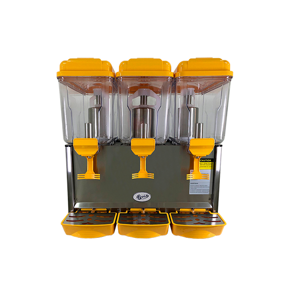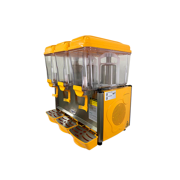 Dispensador de bebidas de 3 tanques con capacidad de 12 litros cada uno, diseñado en un llamativo color amarillo para maximizar la visibilidad del producto. Cuenta con velocidad ajustable, control de temperatura uniforme y un sistema de refrigeración compatible con R290 o R134a (110V). Con un peso de 36 kg y medidas de 430 x 630 x 640 mm, es una solución compacta y eficiente para el despacho de bebidas frías.